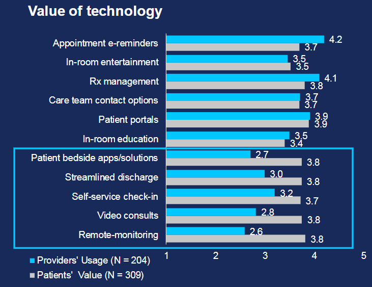 The above graph highlights the usage of patient experience-focused technologies by healthcare providers (blue bars) versus the value patients find in those technologies (grey bars). The graph indicates that healthcare providers should be focused on technologies that enable the patient to engage and interact with their care.